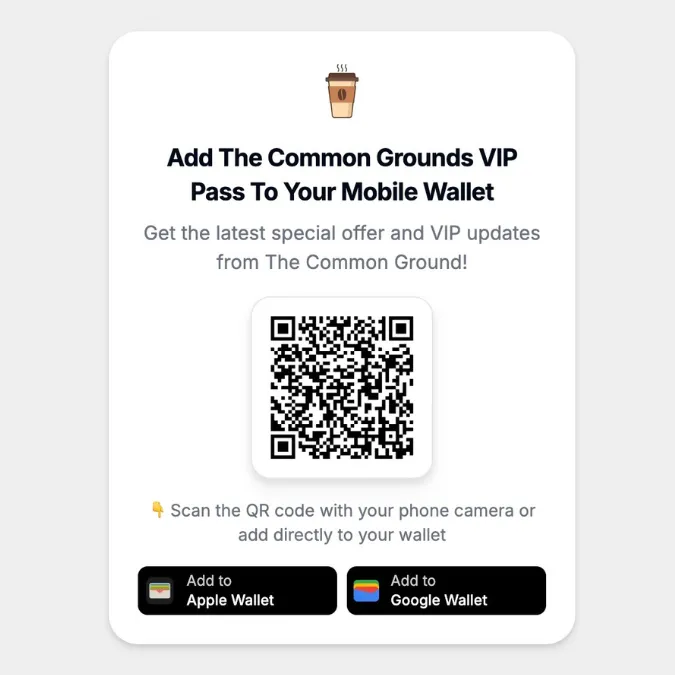 Customers scan a simple QR code in your store or click a link on your website to add the pass to their Apple or Google Wallet in seconds.