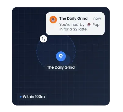 Automatically send a custom offer to a customer's phone the moment they are near your business. Remind a previous customer you're just around the corner, or capture foot traffic you would have otherwise missed. It's like having a digital billboard that only activates when it matters most.