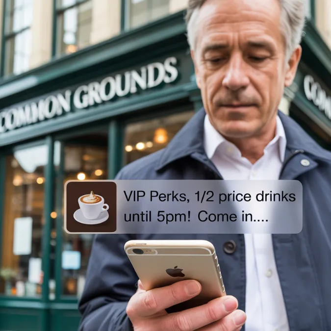 A customer is walking a block away from your cafe. Their phone buzzes with a lock screen alert: "Coffee break? ☕ Your usual order is waiting. Show this for double stamps."